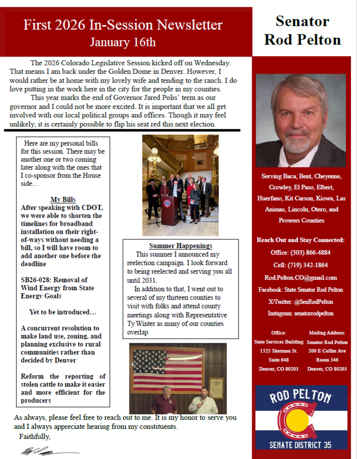 Sen. Rod Pelton is a third-generation Cheyenne County farmer and rancher. Before coming to the Senate in 2023, he served in the Colorado State House of Representatives, and was a Cheyenne County commissioner.
